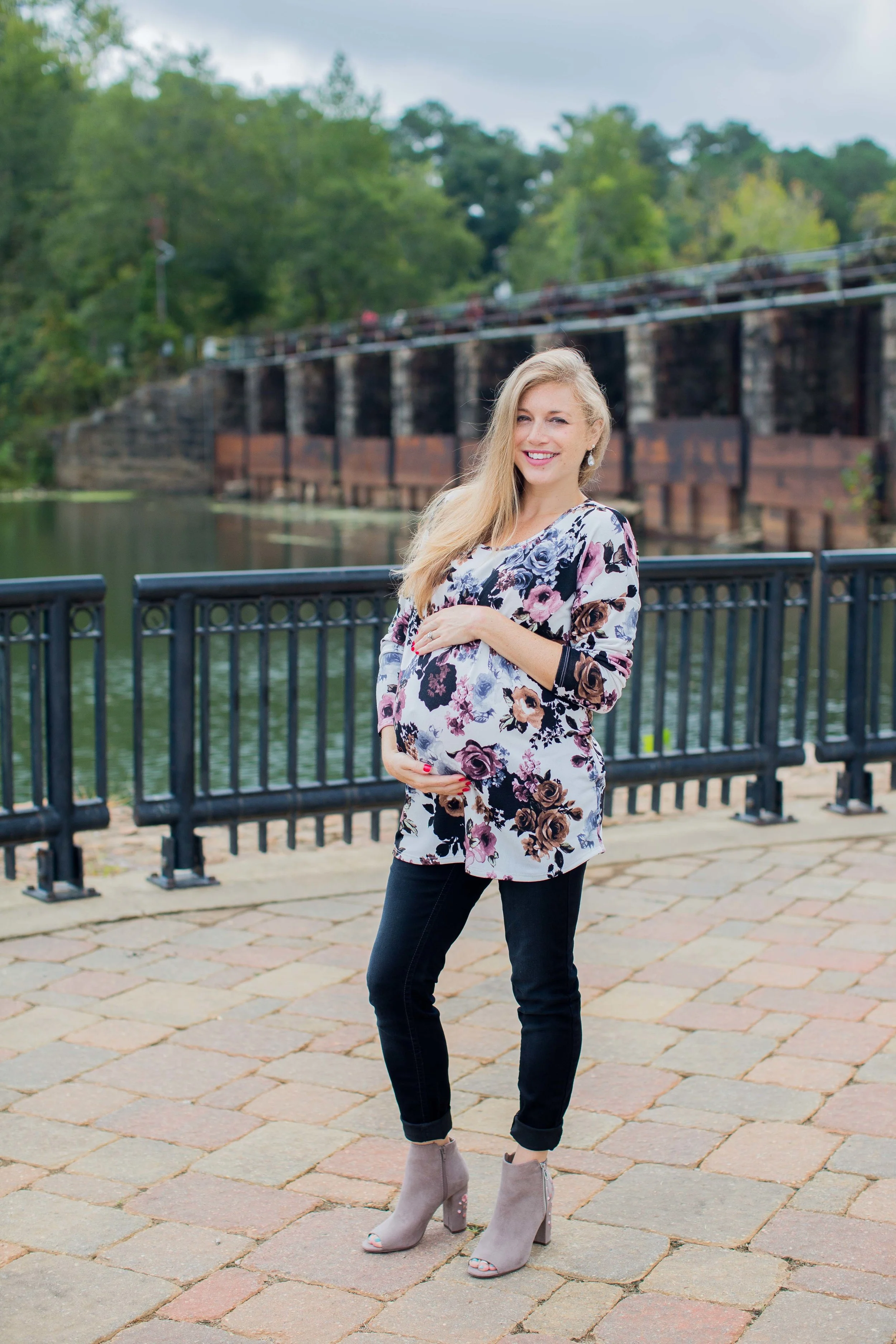 So, this summer I shared a lot of maternity dresses. It's really hot and humid here in South Carolina, like 90°+ hot, so dresses are a must in general. Even getting into the early fall months it's still extremely humid and uncomfortable. But, when it cools down, there is nothing more comfortable to me than a loose blouse, jeans/leggings and ankle boots (especially during pregnancy)!