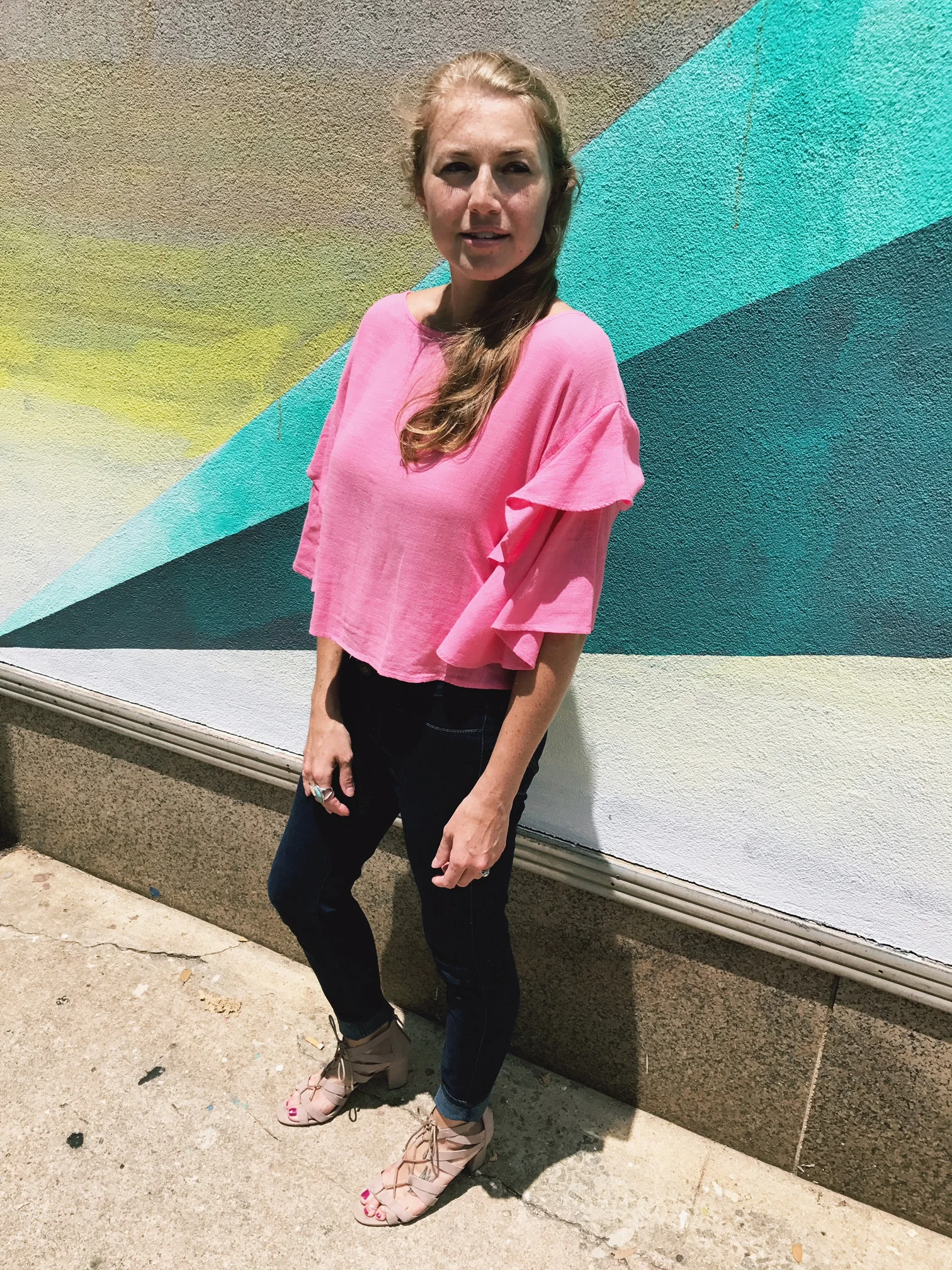 I mean, look at those sleeves! They are the perfect width, length and volume with that adorable double tiered ruffle; it's too cute. The bright bold pink reminds me of a flamingo, and since I haven't been able to find any flamingo tops or rompers that I like, this flirty top was just perfect for me.