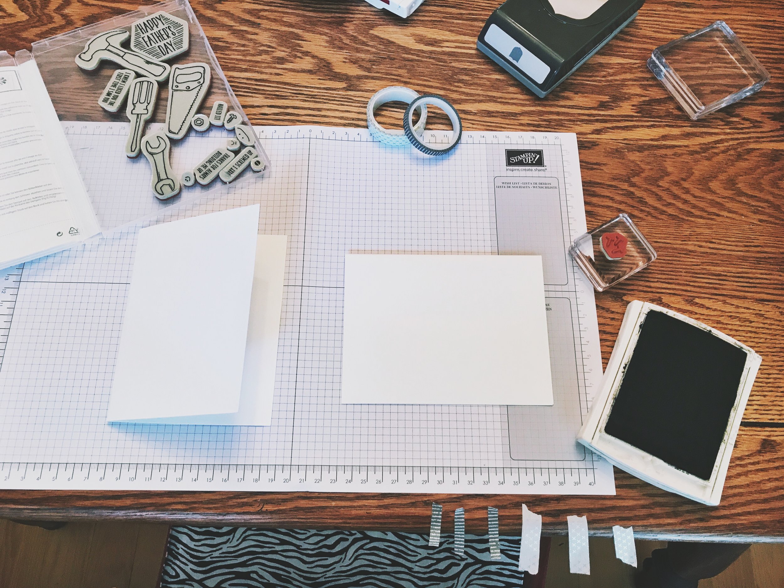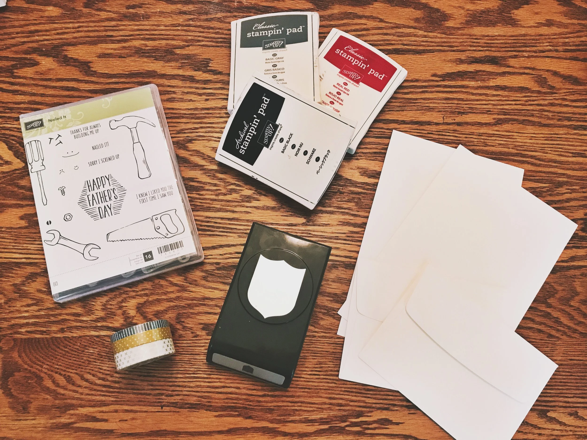 So all that was left, was the card for our gift. I knew this part was something simple enough that my son could help with. It didn't require a long attention span, and was fairly easy in its process from start to finish. My mom is a Stampin Up demonstrator, so she has all these amazingly cute crafting supplies readily available. But you could always go to Michael's or Hobby Lobby if you needed to pick up some stamps & ink pads in a rush. Here are a few of the items you will need to create a quick and unique card (for any occasion really) with your toddler.