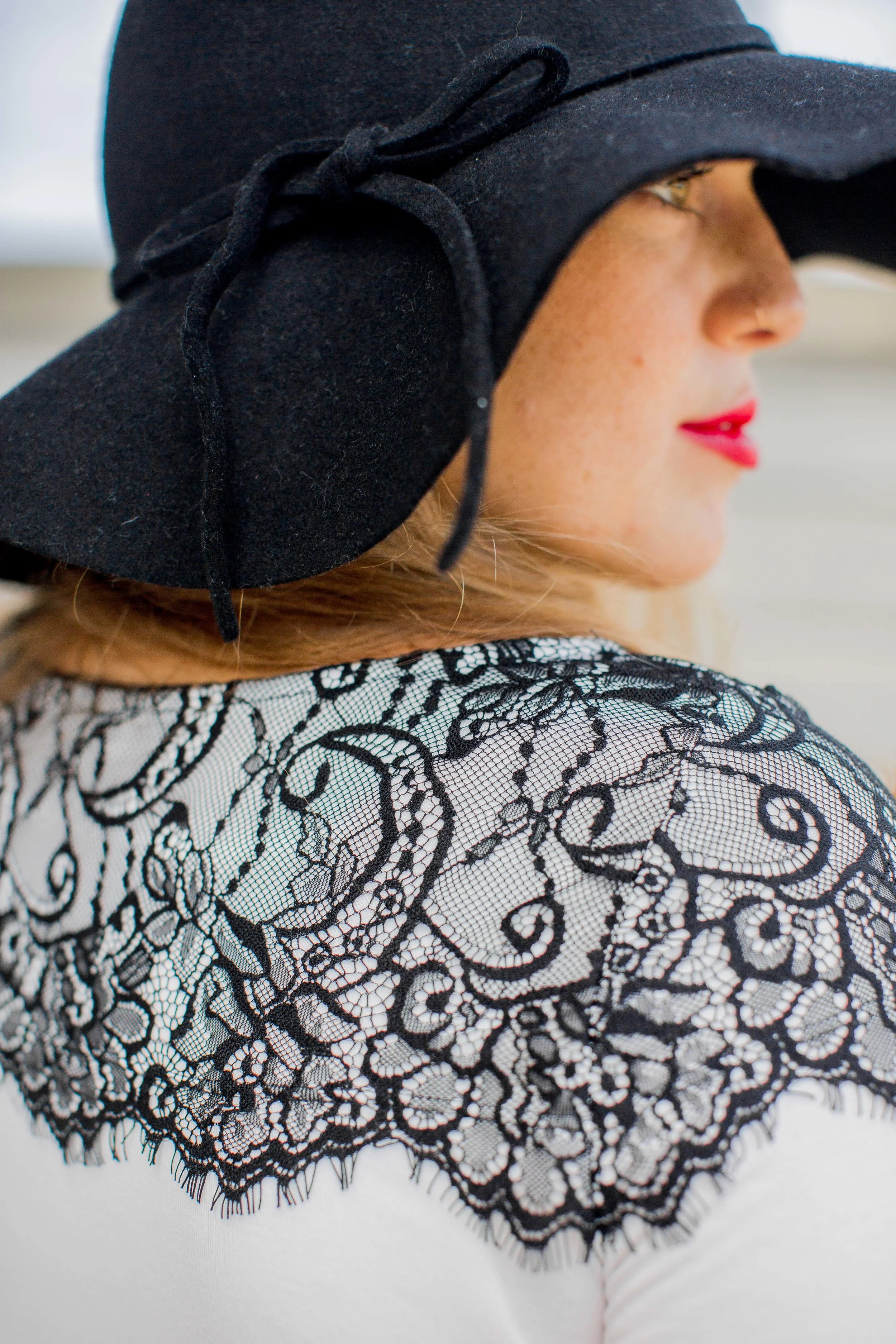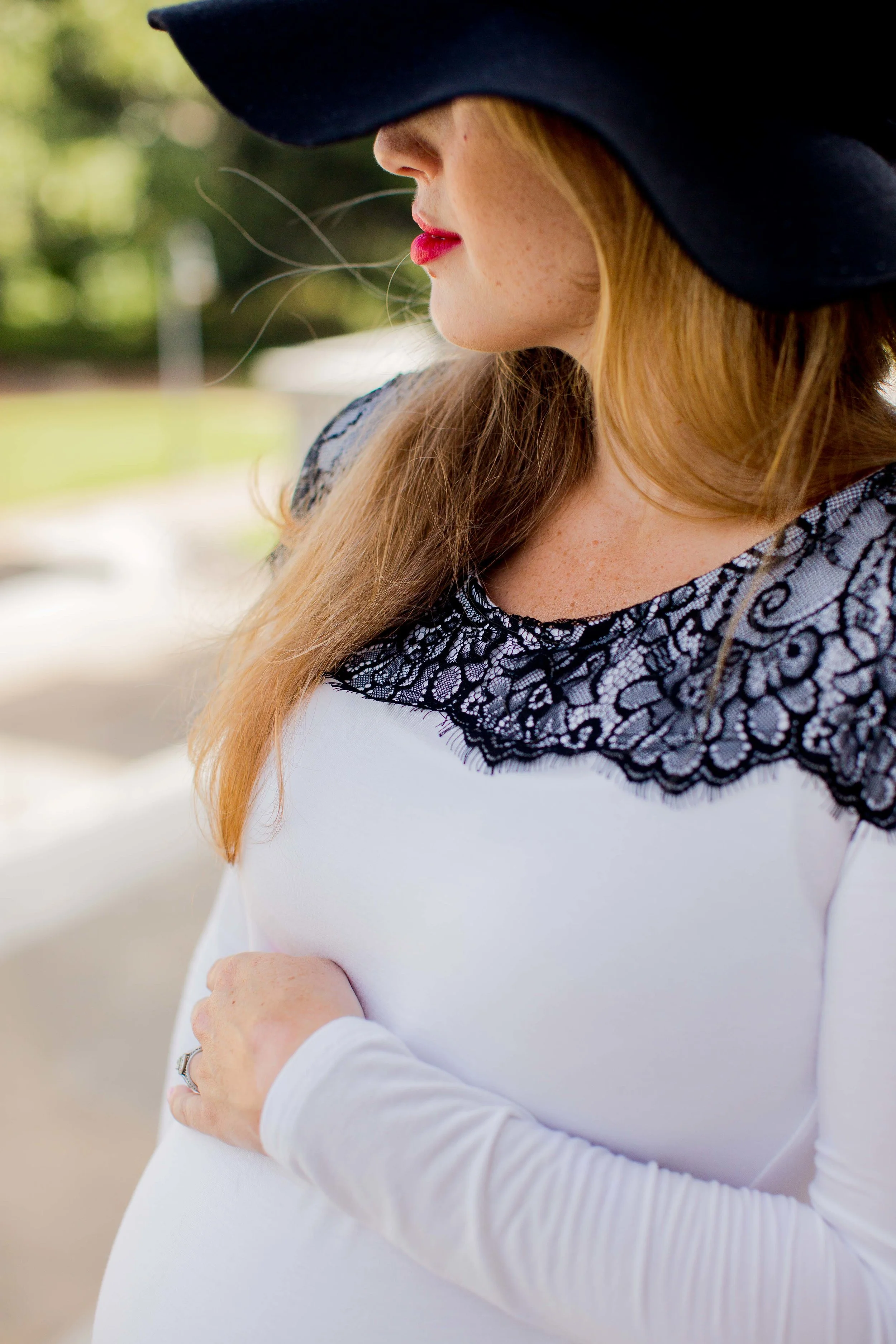 This was another piece that I had a very similar style already in my wardrobe. I have a cream long sleeve top with cream lace on the shoulders, that is not a maternity fit. I tried that top on recently, and it does not flatter a pregnant body, even though it is a loose style. This top, however, is made to flatter during pregnancy. I love the contrasting black lace with the cream base tunic. It's also very comfortable! This piece was so fun and easy to style. You could literally wear any color pants and cute fall booties. My favorite accessories for this style were the hat and oxblood wedges. I felt so high fashion and glamorous! (They offer this top in grey as well)