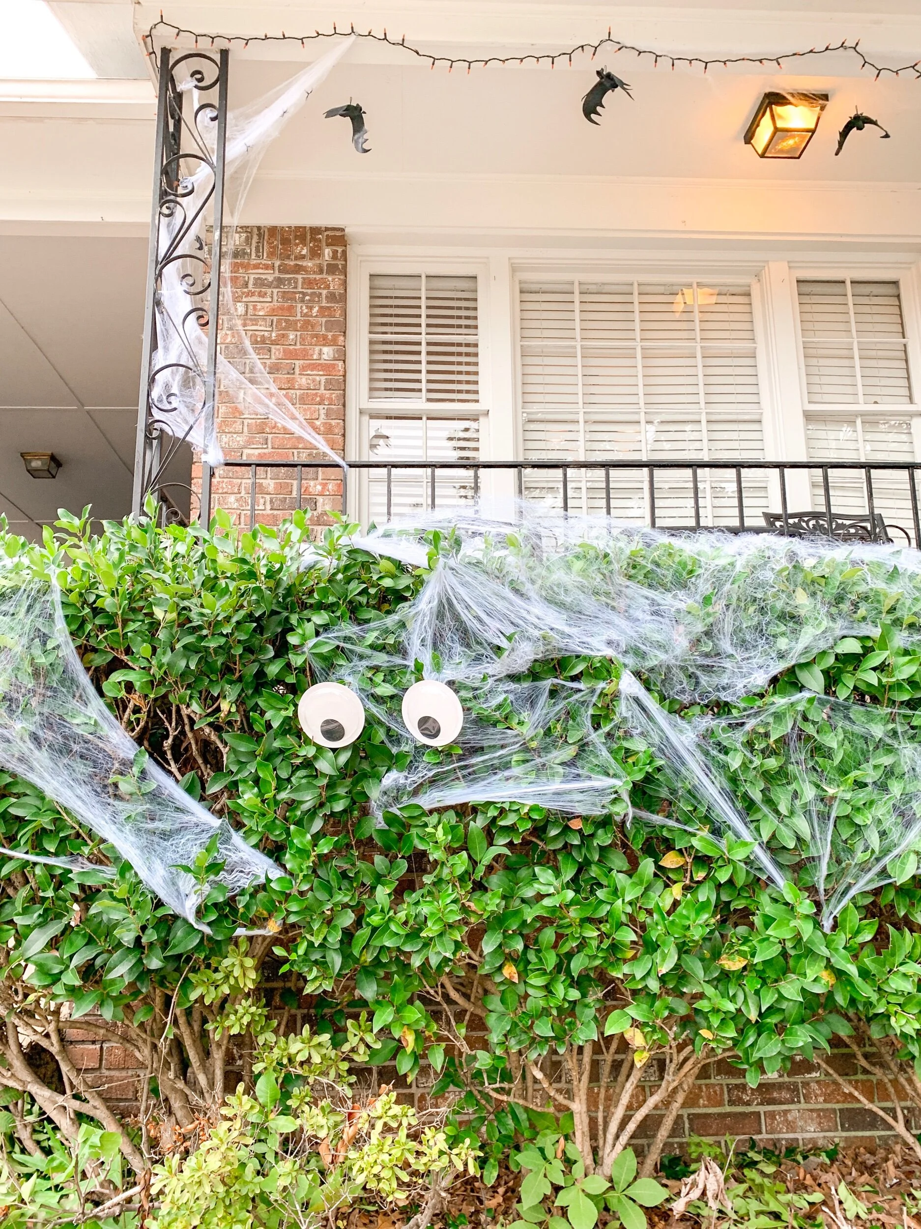 Got 5 plastic bats for $5. One pack of spider webbing covered everything outside. Everything. One set of googly glow in the dark eyes = $1. Love finding affordable Halloween decorations for only a dollar.