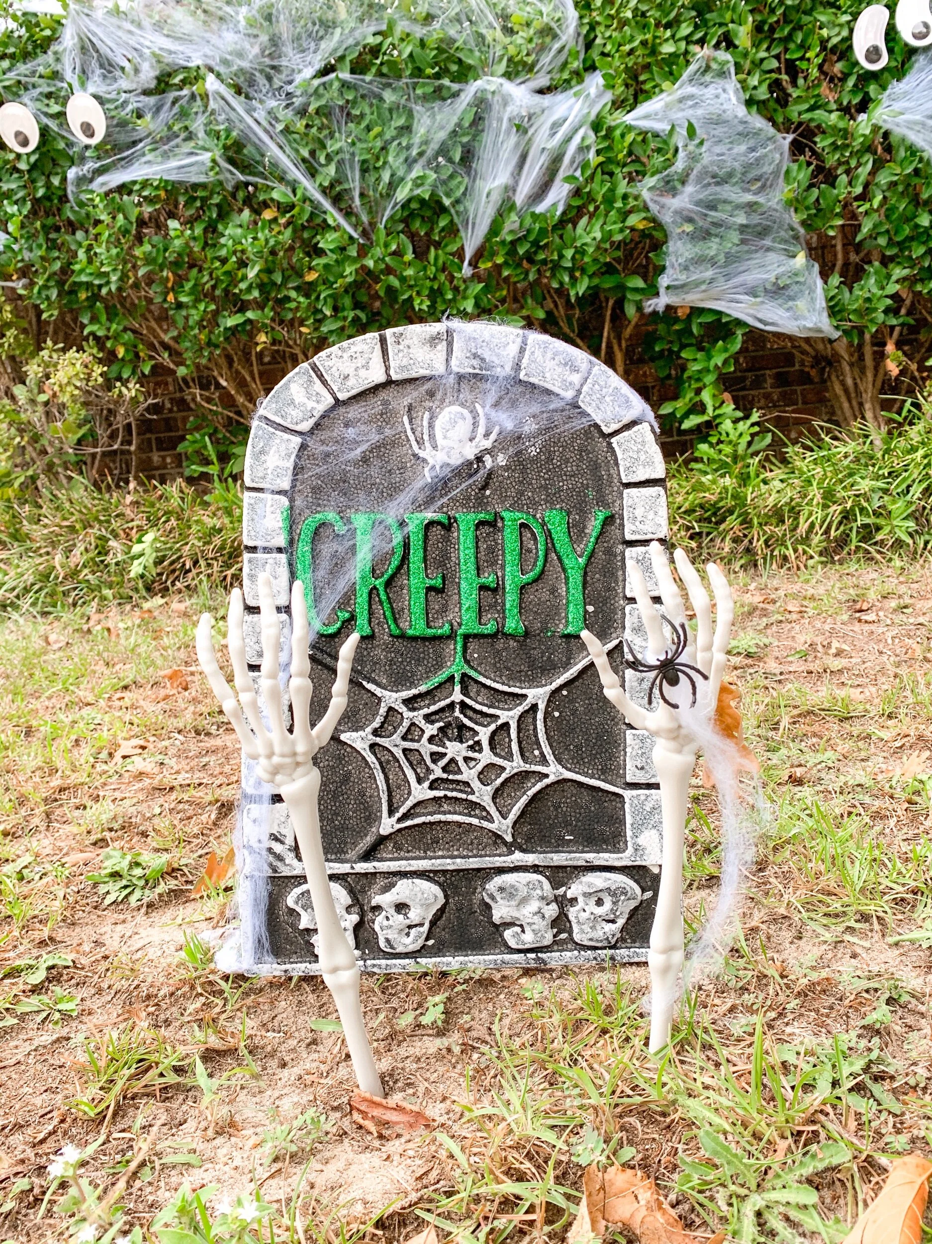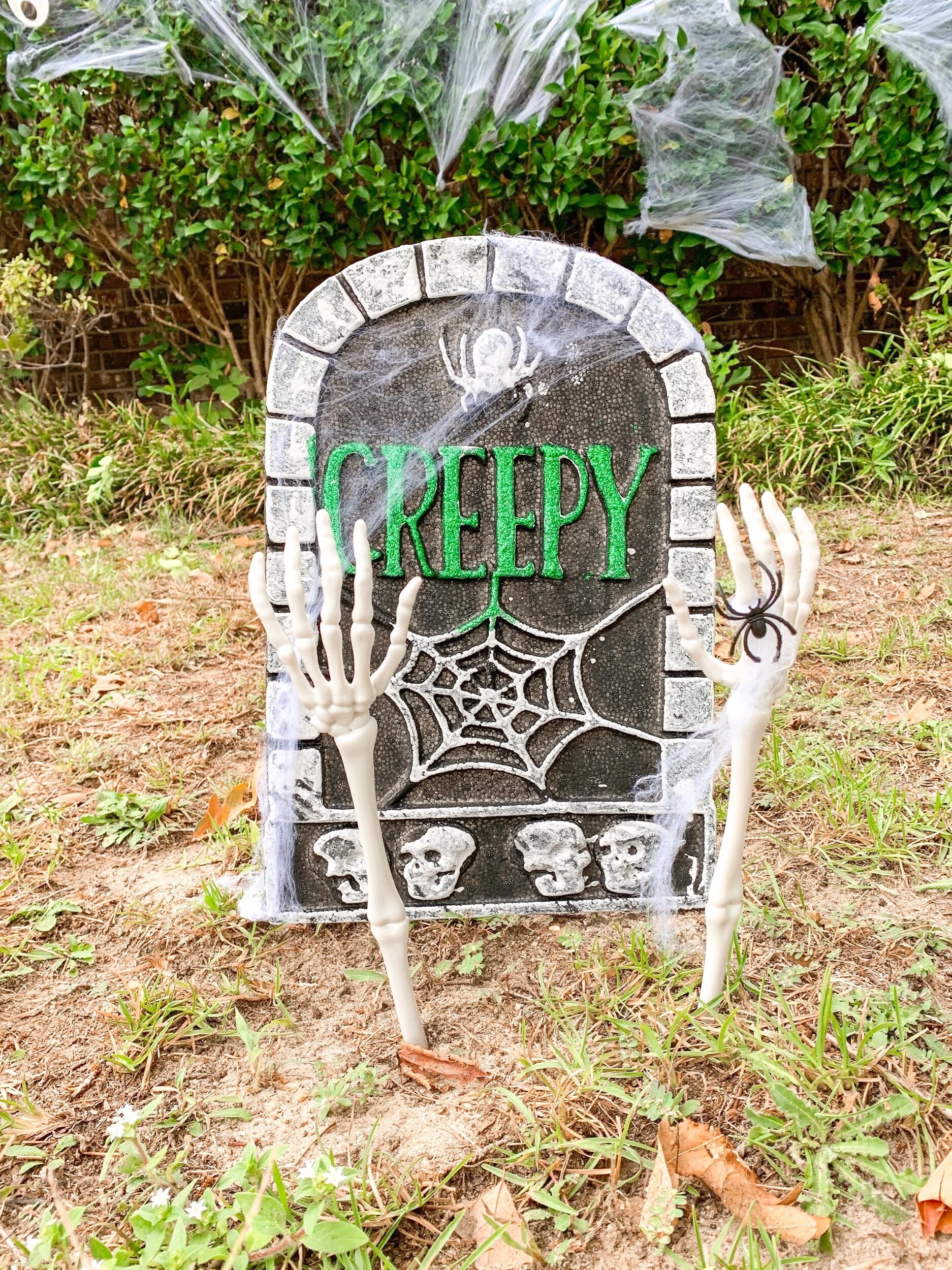 My favorite easy affordable Halloween decoration from the Dollar Tree!! $1 styrofoam gravestone , $1 skeleton arms (actually tongs), $1 spider webbing with spiders. $3 is NOT a bad deal.