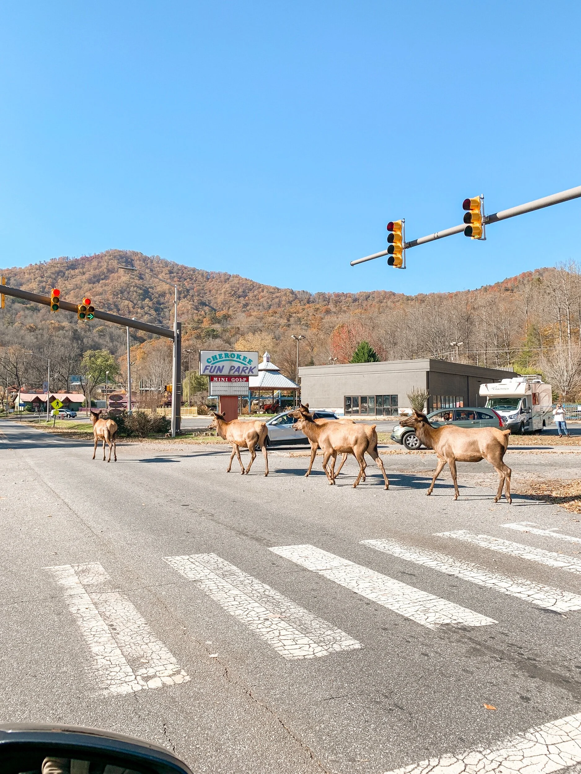 A herd of elk crossing the road in Cherokee North Carolina right next to the Great Smoky Mountains