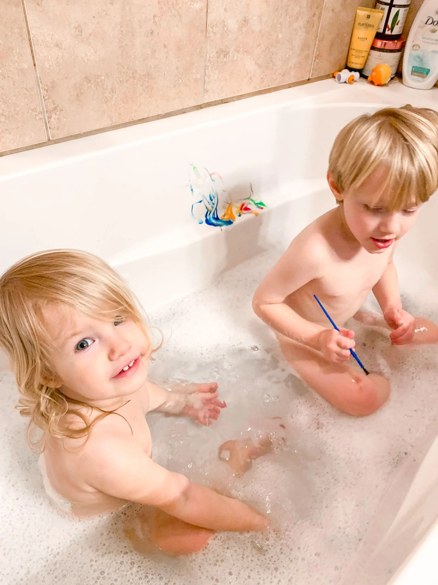 6:45/7:15pm Bath time. The kids take a bath together but we’re probably growing out of that phase… they LOVE bath time! We make it fun with bath crayons, water paints and bath fizzies.