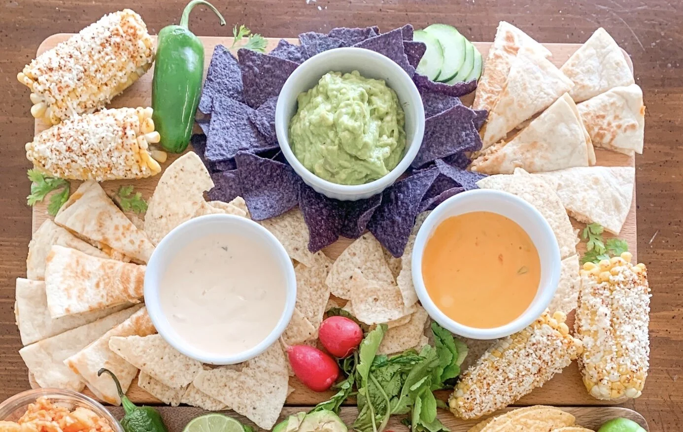 Cinco de Mayo nacho appetizer snack board (add radishes & cucumbers for palate cleansers!)