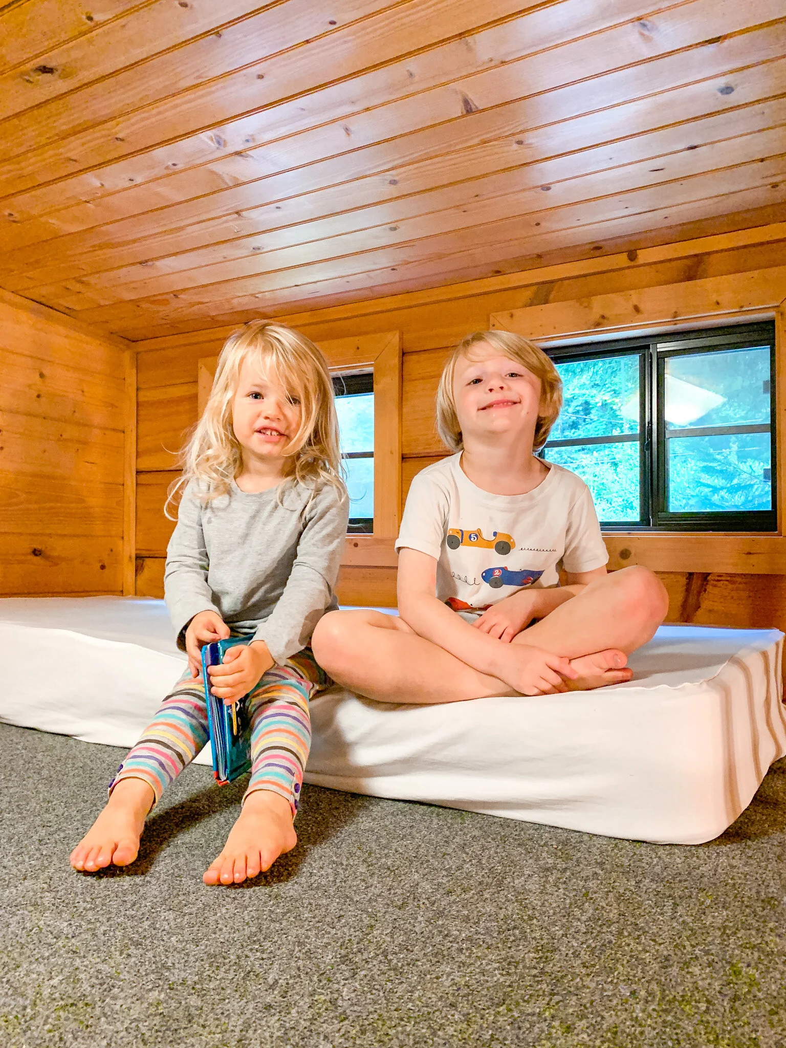 Our cabin came with a master bedroom with a Queen bed, a couch/futon that pulled out into a Full and two Twin beds in the cutest little loft. Our kids really enjoyed that part! Although ours were too little to actually sleep up there, it would be ideal for families with a bit older children or a bigger group.