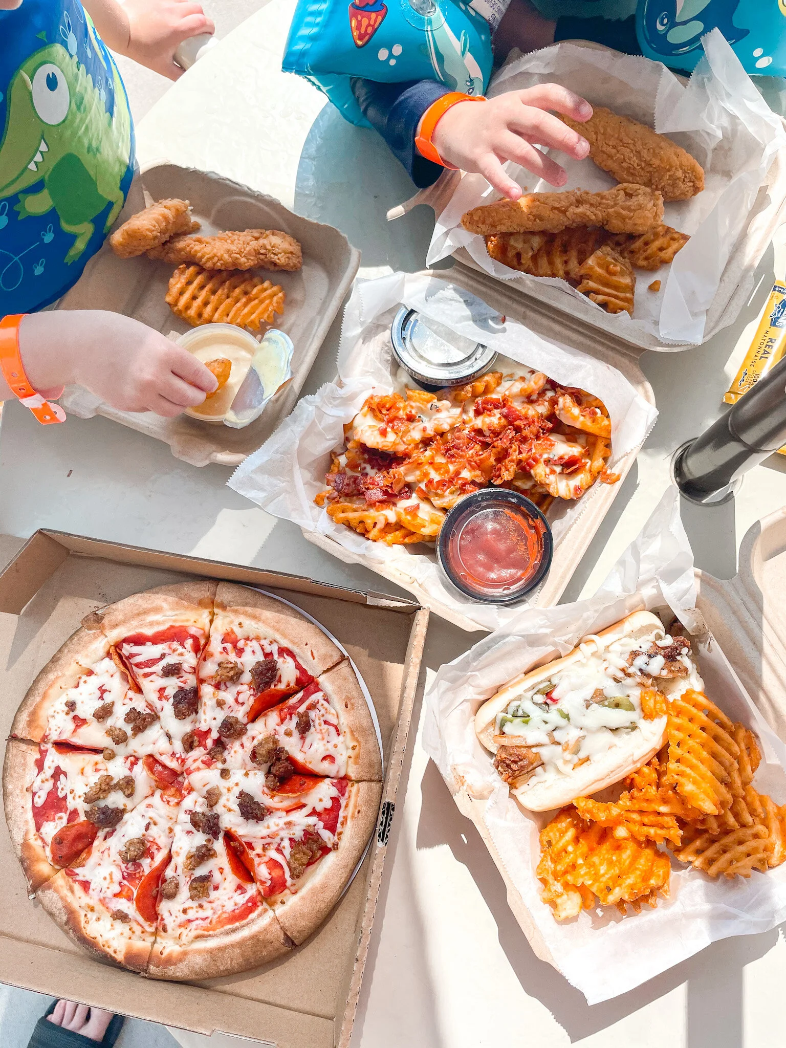 We ate at the Creekside Café beside the pool. They have wood oven pizzas, wraps, burgers, amazing loaded French fries, homemade ice cream and more. Perfect for kids!