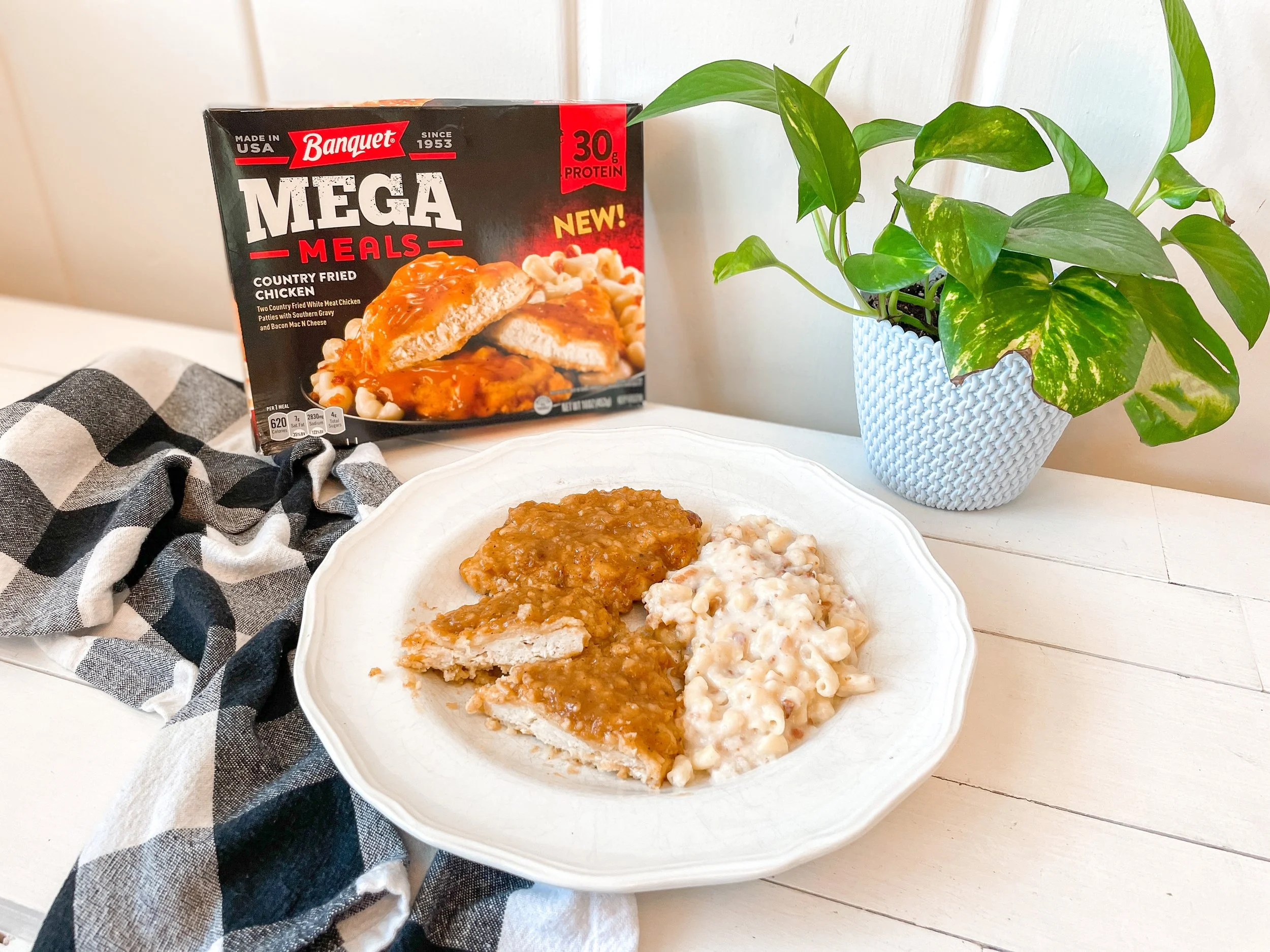 Banquet Country Fried Chicken MEGA Meal has a delicious country flavor with white meat chicken patties topped with southern gravy. This dish is accompanied with a side of bacon mac & cheese. So flavorful!