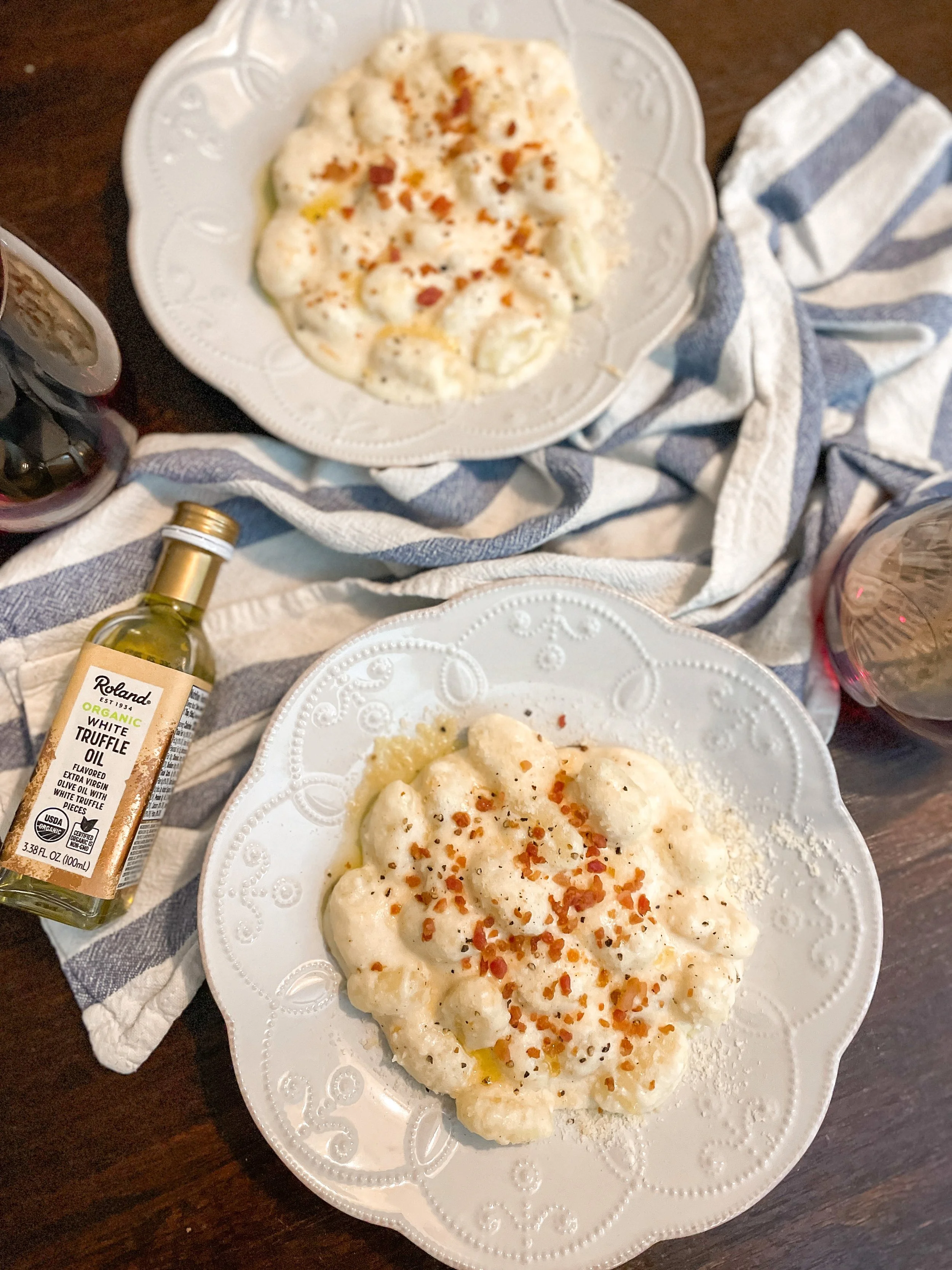 This Organic White Truffle Oil pairs well with pasta, soups and roasted vegetables. Here’s the recipe for the Gnocchi Truffle Alfredo I made (it was delicious!). More ideas using truffle oil HERE